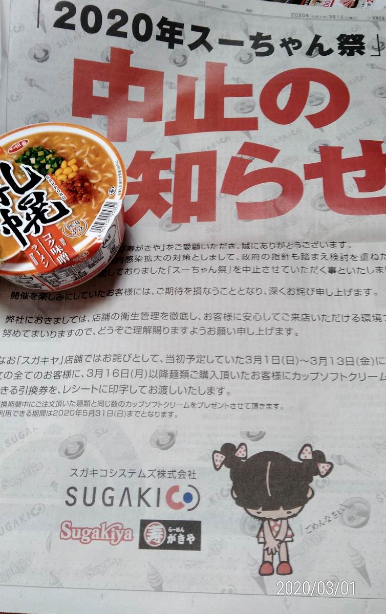 おはこんにちはでつ。新聞で時勢に合わせ すぅちゃん祭り中止~!何か食べるとソフトクリーム無料券(*_*) ラーメン無料券だったが…